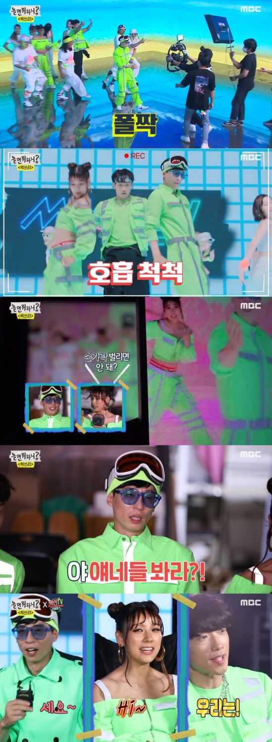 이날 '놀면 뭐하니'에서는 싹쓰리의 데뷔 준비 에피소드가 계속 이어졌다. 먼저 싹쓰리는 지난 회 열심히 연습한 타이틀곡 '다시 여기 바닷가'의 뮤직비디오 촬영에 돌입했다. 90년대 컨셉에 맞게 의상을 갖춰입고 상큼한 퍼포먼스를 소화해 낸 세 사람은 모니터링에 들어갔다.