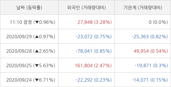 오늘 외국인은 2만 7848주 순매수 하는 것으로 잠정 집계되고 있다. 최근 5일 동안 개인 투자자들은 24만 470주 순매수 했고, 외국인과 기관은 각각 9927주 순매도, 2만 6899주 순매수 했다.