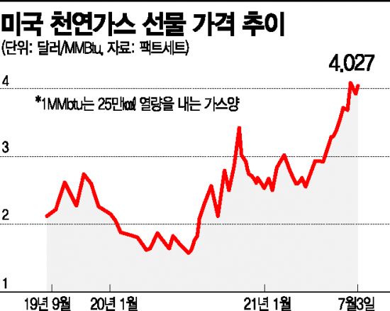 천연가스 가격이 지난 4월 이후로만 37% 치솟아 올 여름 가장 뜨거운 원자재가 됐다고 월스트리트저널이 2일(현지시간) 보도했다. 3일 기준 천연가스 선물 가격은 MMBtu(25만㎉ 열량을 내는 가스양)당 4.027달러로 지난해 이맘때 가격의 두 배를 웃돈다.