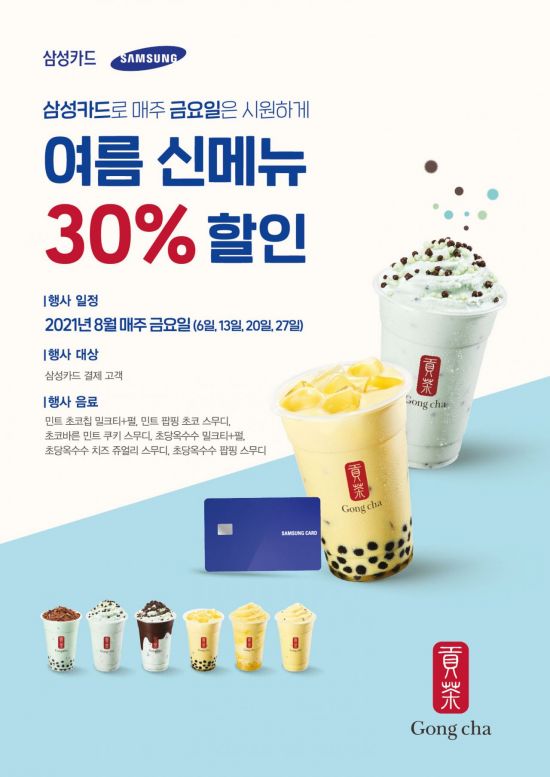 [아시아경제 문혜원 기자] 공차코리아는 이달 한 달간 매주 금요일(6일, 13일, 20일, 27일)에 삼성카드로 결제하면 여름 신메뉴 를 30% 할인해주는 행사를 진행한다고 6일 밝혔다.