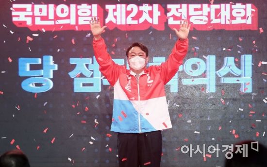 윤석열 국민의힘 대통령 후보가 5일 오후 서울 용산구 백범김구기념관에서 열린 제2차 전당대회에서 대선 후보에 최종 선출된 후 당 점퍼를 입고 인사하고 있다./국회사진기자단