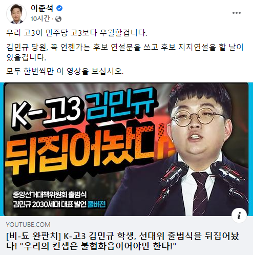 이준석 국민의힘 대표가 6일 고등학교 3학년 김민규군의 당 선대위 출범식 연설 영상을 페이스북에 공유하면서 "우리 고3이 더불어민주당 고3보다 우월할 것"이라고 적었다./사진=이 대표 페이스북 캡처