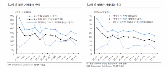 한편 가상자산 거래 규모는 꾸준히 증가했다. 올해 개인 주식 거래대금은 4936조원, 일평균 19조9000억원 수준으로 예상된다. 국내 4대 가상자산 거래소는 연간 거래대금 4조달러(4750조원), 일평균 109억달러다. 지난해 말 대비 개인 가상자산 보유액이 50조원 가량 증가한 것으로 추정된다. 규모 측면에서는 제도권 증시와 경쟁관계로 볼 수 있다는 것이다.