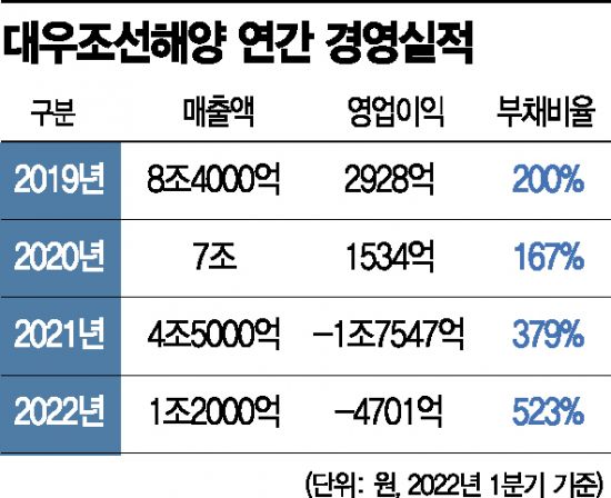 불투명한 수익성도 정상화의 발목을 잡고 있다. 3월 말 기준 대우조선해양의 부채비율은 500%를 넘어섰고 영업적자와 순손실을 동시 기록했다. 자본총액 1조6359억원, 부채총액 8조9424억원으로 부채비율이 546.6%에 달한다.