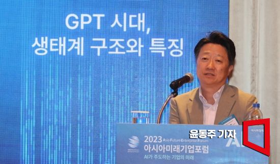 아시아경제 주최로 17일 서울 중구 롯데호텔에서 열린 '2023 아시아미래기업포럼'에서 이상구 서울대 컴퓨터공학부 교수가 GPT 시대, 생태계 구조와 특징이라는 주제로 강연을 하고 있다. 사진=윤동주 기자 doso7@