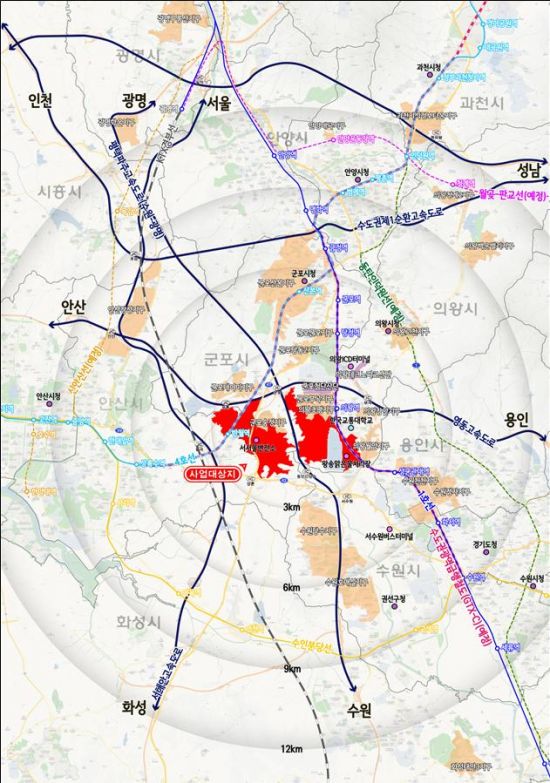 특히 3개 지자체에 걸쳐 있는 지리적 특성과 GTX-C 의왕역(예정) 등 우수한 교통여건을 고려해 '콤팩트 앤 네트워크 시티(Compact & Network City)'라는 개발방향을 목표로 수도권 서남부지역의 새로운 거점도시로 조성할 계획이다.