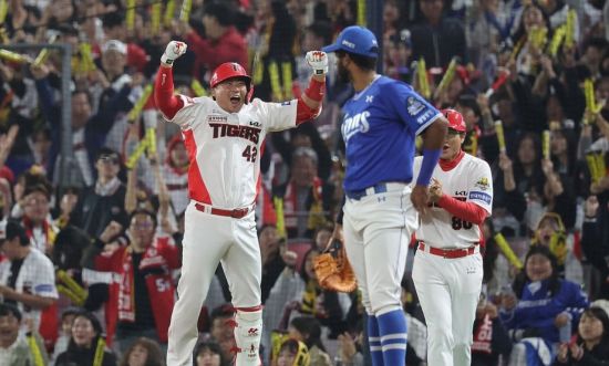 28일 광주 기아챔피언스필드에서 열린 2024 신한 SOL뱅크 KBO 포스트시즌 한국시리즈 5차전 삼성 라이온즈와 KIA 타이거즈의 경기. 6회말 1사 1,3루 KIA 김태군이 1타점 역전 적시타를 친 뒤 기뻐하고 있다. [사진=연합뉴스]