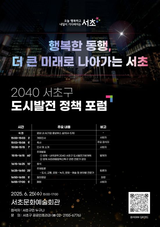 전성수 서초구청장은 “이번 정책포럼은 2040 도시발전기본계획의 실질적인 첫걸음이자 지역 맞춤형 도시정책을 현실화하기 위한 출발점”이라며 “주민과 소통하며 계획을 차질 없이 추진해 서초가 지속 가능하고 살기 좋은 도시가 되도록 최선을 다하겠다”고 말했다.