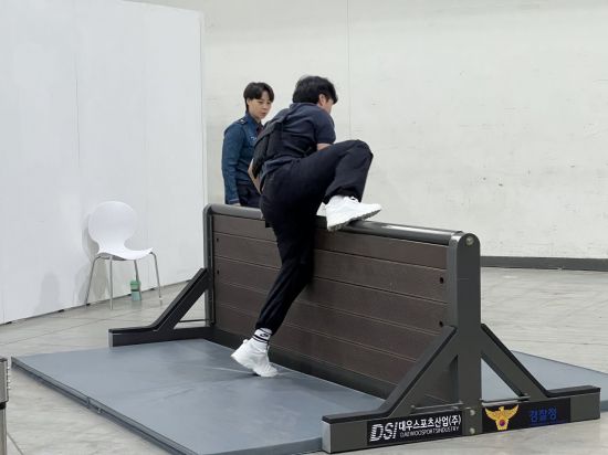 경찰관에게 체력시험 코스 설명을 들은 뒤 4.2㎏ 조끼를 착용하고 시험장에 들어섰다. 시작 버튼을 누르자 카운트다운이 시작됐고, 첫 코스인 장애물 달리기에 돌입했다. 높이 0.6m 허들, 1.5m 매트·장벽을 넘고 5단 계단을 오르내리는 코스를 총 6바퀴 도는 종목이다. 1.5m 매트·장벽에서 힘을 많이 소모했고, 코스 순서가 헷갈려 방향을 되짚느라 시간을 허비했다. 결정적인 고비는 4바퀴째부터 찾아왔다. 숨이 차고 다리에 힘이 빠지기 시작했다. 마지막 바퀴에서는 가까스로 허들을 넘으며 전력을 다해 달렸고, 코스를 마치니 2분10초가 지나 있었다.