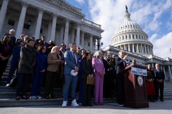 하킴 제프리스 민주당 하원 원내대표가 12일(현지시간) 워싱턴 DC 연방의회 의사당 밖에서 열린 기자회견에서 민주당 하원의원들과 함께 보건의료 정책과 정부 셧다운 종료 표결 계획에 대해 발언하고 있다. AFP연합뉴스