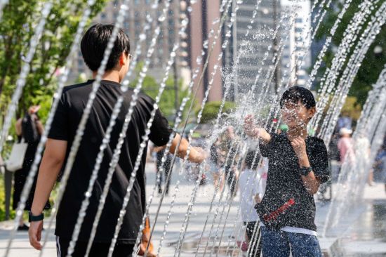서울 한 낮 최고기온이 25도까지 상승하며 초여름 날씨가 이어지고 있는 5일 서울 종로구 광화문 광장을 찾은 어린이들이 물놀이를 하며 더위를 식히고 있다.