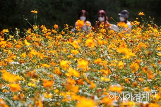 On the 14th, with clear autumn weather, yellow cosmos flowers are in full bloom near the Yangjaecheon waterfront stage in Seocho-gu, Seoul. Citizens walking along the flower path in the cool breeze appear to have light steps. Photo by Moon Honam munonam@