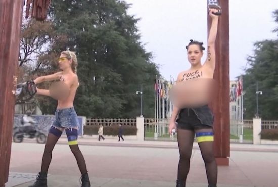 On the 13th (local time), according to foreign media including The Economic Times, three feminist activists damaged sculptures while protesting the Russia-Ukraine war in front of the United Nations building in Geneva, Switzerland. They are known to belong to the group 'FEMEN,' famous for provocative protests.