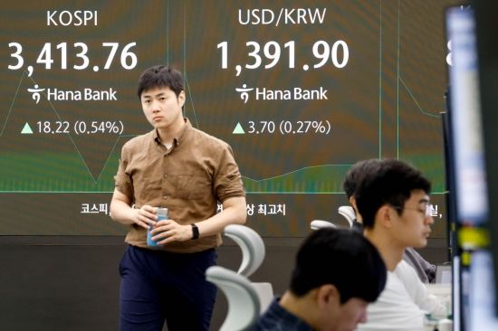 On the 15th, when the KOSPI index, which has been recording consecutive all-time highs, surpassed the 3400 mark for the first time in history, dealers were working in the dealing room at the Hana Bank headquarters in Jung-gu, Seoul. Photo by Kang Jinhyung
