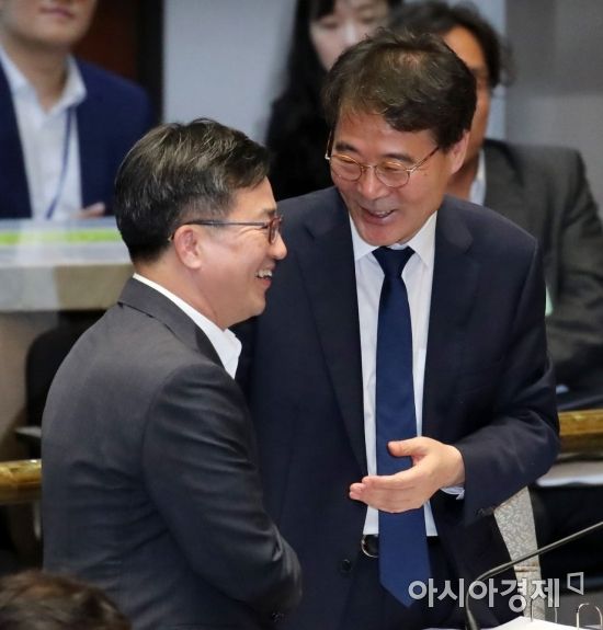 장하성 청와대 정책실장이 22일 국회에서 열린 예산결산특위 전체회의에 출석, 김동연 경제부총리와 인사를 나누고 있다./윤동주 기자 doso7@조해동 문화일보 기자가 쓴 '진보정부의 경제권력'은 이 논쟁을 개혁파와 관료파의 주도권 싸움으로 해석하고 다룬다. 그러면서 노무현 정부 출범 초기에 있었던 비슷한 사례를 제시한다. 김진표 전 부총리 겸 재정경제부 장관과 이정우 전 청와대 정책실장의 충돌이다. "세종 관가에서는 오래 전부터 '진보 대통령은 관료파와 개혁파 중에서 어느 한쪽 손을 일방적으로 들어주기 어렵다'는 분석이 지배적이었다. 진보 대통령이 관료파의 손을 일방적으로 들어주면 자신의 지지 기반인 개혁파가 돌아설 것이고, 개혁파의 손을 일방적으로 들어주면 향후 관료를 장관으로 충원하기 어려워질 뿐만 아니라 관료 집단 전체가 사보타주(일이나 공부 따위를 게을리 함)에 나설 가능성이 있기 때문이다."