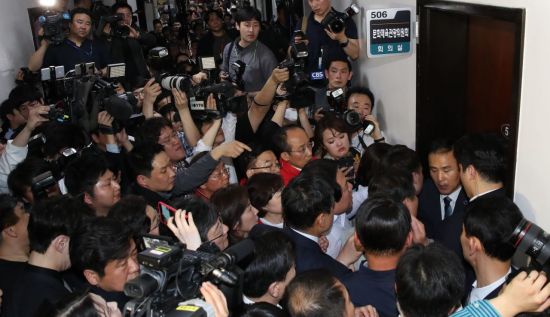 220호 앞에서 연좌시위를 하던 나경원 자유한국당 원내대표 등 한국당 의원들은 바뀐 회의실 앞에서 "날치기하지말라"면서 문을 열 것을 요구하고 있다.