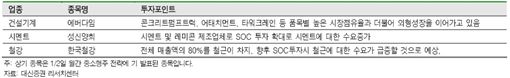박 애널리스트는 "사업 진행 중 직간접적으로 연관이 있는 건설기계, 시멘트, 철강업종으로 한정될 것"이라며 SOC 투자 확대에 따른 중소형주 톱픽스(최선호주)로는 , , 을 추천했다.