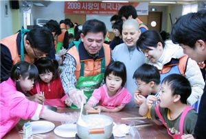 지난 17일 봉사단원들과 장애아동 보육시설 승가원(서울 안암동)을 찾은 미래에셋봉사단장 이계원 상무(사진 뒷줄 좌측에서 두번째)가 장애아동들과 함께 떡국을 준비하고 있는 모습