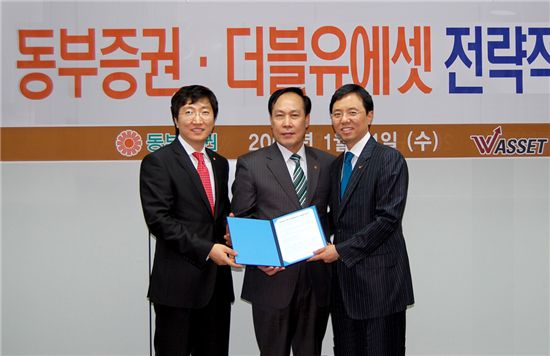 동부증권과 더블유에셋이 21일 동부증권 본사에서 전략적 업무제휴를 체결하고 있다. 왼쪽부터 조병수 더블유에셋 대표, 장능원 동부증권 리테일사업부장(부사장), 홍재열 더블유에셋 대표
