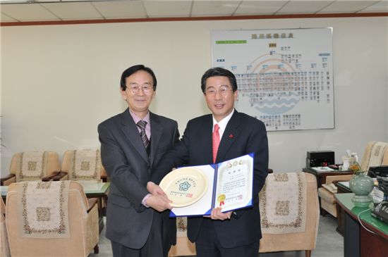 추재엽 양천구청장(오른쪽)이 자랑스런 칭찬 주인공 표창을 받았다.