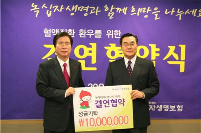 녹십자생명보험(대표 김손영 사진右)은 23일 서울 신대방동 소재 녹십자생명 본사에서 한국혈액암협회와 '혈액질환 환우를 위한 결연협약'을 맺고 1000만원의 성금을 기탁했다고 밝혔다.