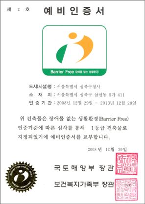 장애물 없는 생활환경 예비인증 제도는 사회적 약자의 접근성과 이동편의 보장을 위해 2008년 7월 15일 시행됐다. 성북구는 1등급 인정을 목표로 지난해 4월 실무단을 구성하고 자체 평가를 통해 미비 사항들을 점검해 왔다. 그간 성북구는 출입구 접근로와 장애인전용 주차구역에서부터 점자블록과 시각장애인 음성안내, 청각장애인 문자안내 그리고 승강기와 화장실, 대강당 관람석에 이르기까지 14개 항목 25개 세부사항들을 집중 보완했다. 이 같은 노력을 통해 성북구는 지난달 총 115개 평가지표를 바탕으로 한 재단법인 한국장애인개발원 예비인증 심사에서 만점 대비 91.4% 점수를 얻어 90% 이상일 때만 주어지는 예비인증 1등급을 획득했다. 한편 성북구는 지난 23일 국토해양부 회의실에서 인증 주무기관인 국토해양부와 보건복지가족부로부터 예비인증서를 교부받았다.성북구 신청사