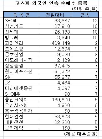 <표> 코스피 외국인 연속 순매수 상위 20종목