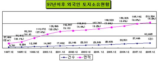국토해양부는 작년 말 기준 외국인이 소유한 토지는 6.2% 증가한 전체 2억 1035만㎡(210.35㎢)로 28조 9157억원(신고기준)에 이른다고 10일 밝혔다.