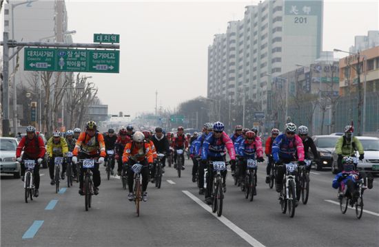 국내외 100개 업체가 참여 300여개 부스를 설치하고 자전거 기능 체험장 및 이벤트를 통해 친환경, 에너지절약 및 건강증진 등 자전거 장점을 체험할 수 있도록 기획됐다.맹정주 강남구청장(오른쪽 세번째)가 코리아바이크 페스티벌 출발 신호탄을 울렸다.