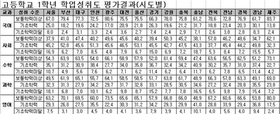 <표>시·도별 고등학교 1학년 학업성취도 평가 결과