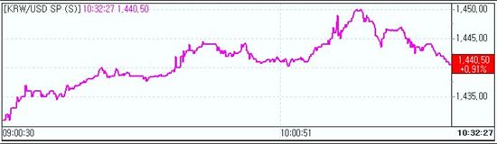 한 시중은행 외환딜러는 "대규모 매수 요인이 있는 것처럼 보일 정도로 매수세가 강해 1440원선까지 쉽게 뚫은 것"이라면서 "외국계 지점, 역외세력 등의 매수세가 강한 것으로 생각된다"고 말했다.