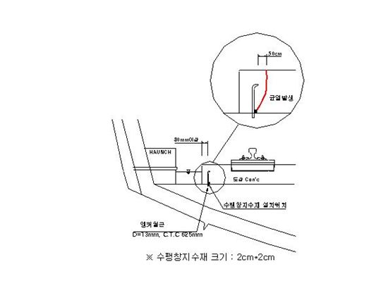분당선 2단계 구간은 2003년 준공 후 하자보수기간(5년) 중 콘크리트 도상균열이 생겨 ‘발생원인 및 보수·보강대책 진단용역(2004년8~9월)’을 한 결과 시공 잘못으로 드러나 시공사와 감리업체가 2004~2005년 하자보수를 했다. 콘크리트 궤도는 바닥면인 구체와 그 위에 도상콘크리트를 설치하고, 그 도상 위에 다시 침목이 놓여있는 구조다. 정밀진단용역 결과 도상콘크리트 끝부분에 콘크리트 양생 때 수분 침입방지용 수팽창지수제가 미세균열을 일으켰고 시간이 지나면서 금이 가거나 틈이 생긴 것으로 분석됐다. 지금 균열이 생긴 곳은 레일과 직접 닿는 침목부분이 아니라 도상콘크리트부분으로 열차 안전운행엔 지장이 없다는 게 코레일 설명이다. 궤도구조상 레일과 침목체결 구조는 이상이 없고 침목을 직접 떠받쳐주는 도상콘크리트 밑엔 균열이 없다는 것. 코레일 관계자는 “단기간에 직접적인 레일 이탈소지가 없어 열차 안전운행에 영향을 주지 않는다”고 말했다. 코레일은 앞으로의 대책으로 한국철도시설공단과 협의, 분당선 전체구간을 정밀점검해 균열이 생긴 곳은 빠른 시일 내 보수할 계획이다. 보수방법은 도상균열이 생긴 곳은 습윤 에폭시로 틈을 메우고 도상콘크리트 틈새보수는 지수콘크리트(수중에서도 굳는 콘크리트)로 채우게 된다.분당선 콘크리트궤도 세부 단면도