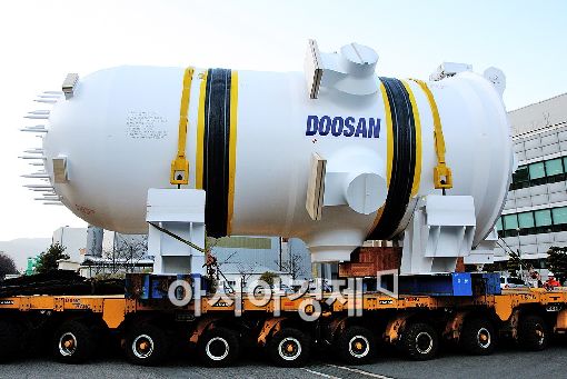 두산중공업이 22일, 1000MW급 신고리 원자력발전소 2호기에 들어갈 원자로 제작을 42개월 만에 마치고 <br /> 창원공장 부두를 통해 출하하고 있다.