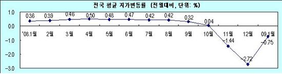 24일 국토해양부가 발표한 지가 및 토지거래량 조사에 따르면 1월 전국 지가는 전월대비 0.75% 하락, 지난해 11월부터 3개월 연속 마이너스 상승률을 기록했다. 전국 모든 시·군·구가 마이너스를 기록한 것은 지난해 12월 이어 2개월 연속이다.