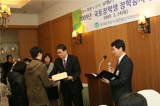 장학금을 주고 있는 한국토지공사 대전충남지역본부 성증수 본부장(오른쪽에서 두번째).