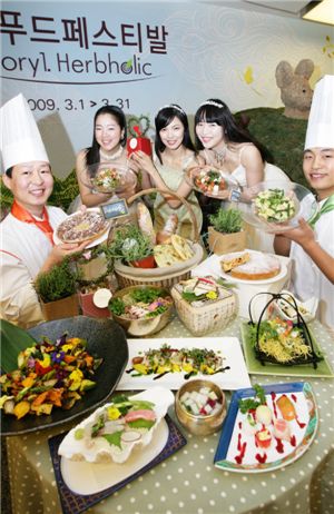25일 서울 여의도 63시티에서 열린 '63푸드 페스티벌-허브홀릭'에서 모델들과 조리사들이 허브동산을 배경으로 다양한 허브음식을 선보이고 있다.