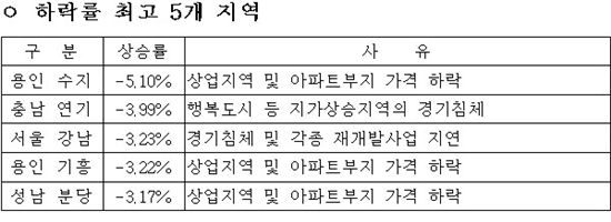 또한 용인시 기흥구가 3.22% 하락한 것으로 조사됐으며 성남시 분당구도 3.17% 하락하며 표준지가가 가장 많이 하락한 곳 4,5위를 각각 차지했다.
