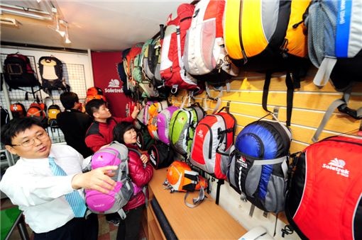 맑고 화창한 날씨가 계속되면서 본격적인 봄 산행에 나서는 사람들이 늘고 있다. 27일 오후 서울 양천구의 한 국산 배낭전문업체 전시실에는 산행을 준비하는 사람들이 찾아 배낭을 구입하고 있다.