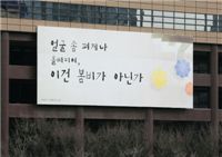 특히 지난 겨울 "아침에는 운명 같은 건 없다. 있는 건 오로지 새날"이라는 희망찬 문구에 이어 또 다시 세태를 반영하는 문구가 내 걸려 눈길을 끈다.