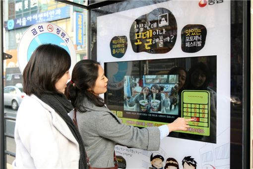 농심이 버스승강장에 마련한 '쌍방향 LCD 포토존'에서 지나가는 시민들이 사진을 찍고 있다.