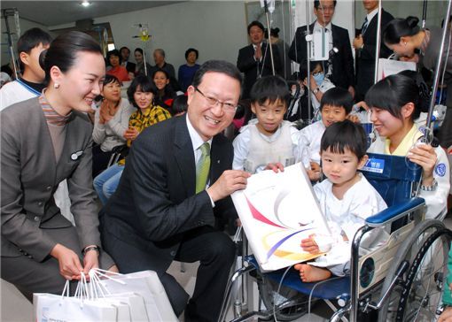 윤영두 아시아나항공 사장(왼쪽에서 두번째)과 아시아나 승무원들이 24일 신촌 연세대 세브란스 어린이병원을 방문해 소아암 어린이들과 기념촬영을 하고 있다.