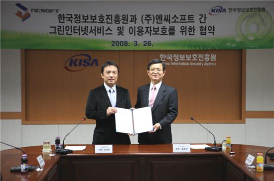 26일 한국정보보호진흥원 회의실에서 황중연 KISA 원장(오른쪽)과 김택진 엔씨소프트 대표(왼쪽)가 '그린 인터넷 서비스 및 이용자 보호에 관한 협약'을 체결하고 있다.