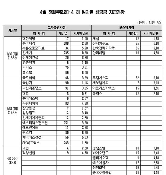 한국예탁결제원은 이번주(3월30~4월3일) 81개 상장사가 1조5718억원 규모의 배당금을 지급한다고 29일 밝혔다.