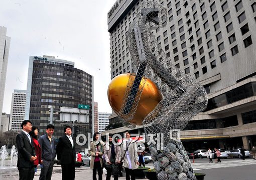 경제불황을 극복하자는 의미로 30일 서울 광장에 전시되고 있는 철골 조형물 '서울, 황금알을 품다'를 지나가는 시민들이 관심있게 지켜보고 있다.