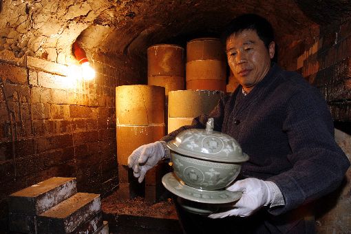 30일 전남 강진군 대구면 강진청자박물관에서 직원들이 유럽전시에 갈 청자를 화목가마에서 조심스럽게 요출하고 있다.