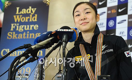 [아시아경제신문 인천공항=이기범 기자]2009 세계 피겨선수권 대회에서 우승을 차지한 스케이트 선수 김연아가 31일 오후 인천공항을 통해 입국, 기자회견을 갖고 있다. 이기범 기자 metro83@asiae.co.kr <ⓒ아시아경제 & 스투닷컴(stoo.com)이 만드는 온오프라인 연예뉴스>