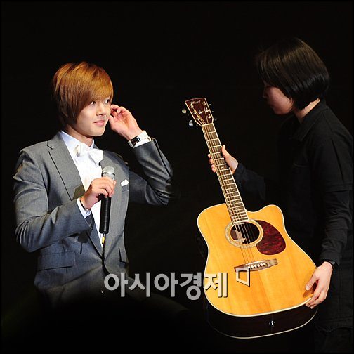 [아시아경제신문 박성기 기자]가수 김현중이 31일 오후 9시 서울 방이동 올림픽공원에서 진행된 'Good Bye 윤지후'에서 기타를 받아들고 있다. 박성기 기자 musictok@asiae.co.kr <ⓒ아시아경제 & 스투닷컴(stoo.com)이 만드는 온오프라인 연예뉴스>