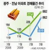 6일 경매 정보업체인 지지옥션에 따르면 3월 중 광주지역 아파트(주상복합아파트 포함) 경매 진행건수는 모두 862건으로, 전월(83건)에 비해 10배, 지난해 같은 기간(119건)보다 7배 가량 폭증했다.