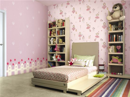 벽지가 하나의 큰 그림으로 완성되는 '뮤럴(mural) 벽지'는 빈 공간에 포인트가 될 수 있다. 일명 '벽화 벽지'라도도 불리는 이 제품은 일정한 패턴이 반복되는 포인트 벽지와 달리 전체가 한 폭의 벽화처럼 연결되는 제품이다. 크고 과감한 패턴이 주를 이루기 때문에 활용하기에 따라서는 시원한 느낌을 주며, 자신만의 개성도 살려준다. 또 정원이나 공원, 숲 속 느낌을 살려 실내가 넓어 보이게 하는 효과를 주거나 유명 화가의 그림이 걸린 갤러리 같은 예술적 느낌도 줄 수 있다. 다만, 화려한 무늬에 쉽게 실증을 느낀다는지, 포인트 벽지를 붙일 곳에 컬러감이 강한 소파나 가전제품을 두어야 한다면 벽지 선택에 신중할 필요가 있다. 인테리어의 포인트는 1~2곳으로만 집중시켜야 혼란스럽지 않고 세련된 공간으로 보일 수 있다는 점을 기억해야 한다.아리 'Happy Birds'