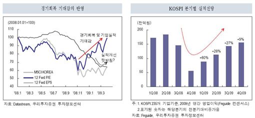 최근 투자심리는 상당히 호전된 게 사실이다. 경기가 저점에 근접했다는 인식 때문이다. 지난해 10월 코스피 지수가 800선일 당시 대다수 경제 전문가들은 미국에서 시작된 금융위기가 실물 경기침체로 이어져 향후 1~2년 내로 경기 회복이 어려울 것이라는 비관론에 표를 던졌다.